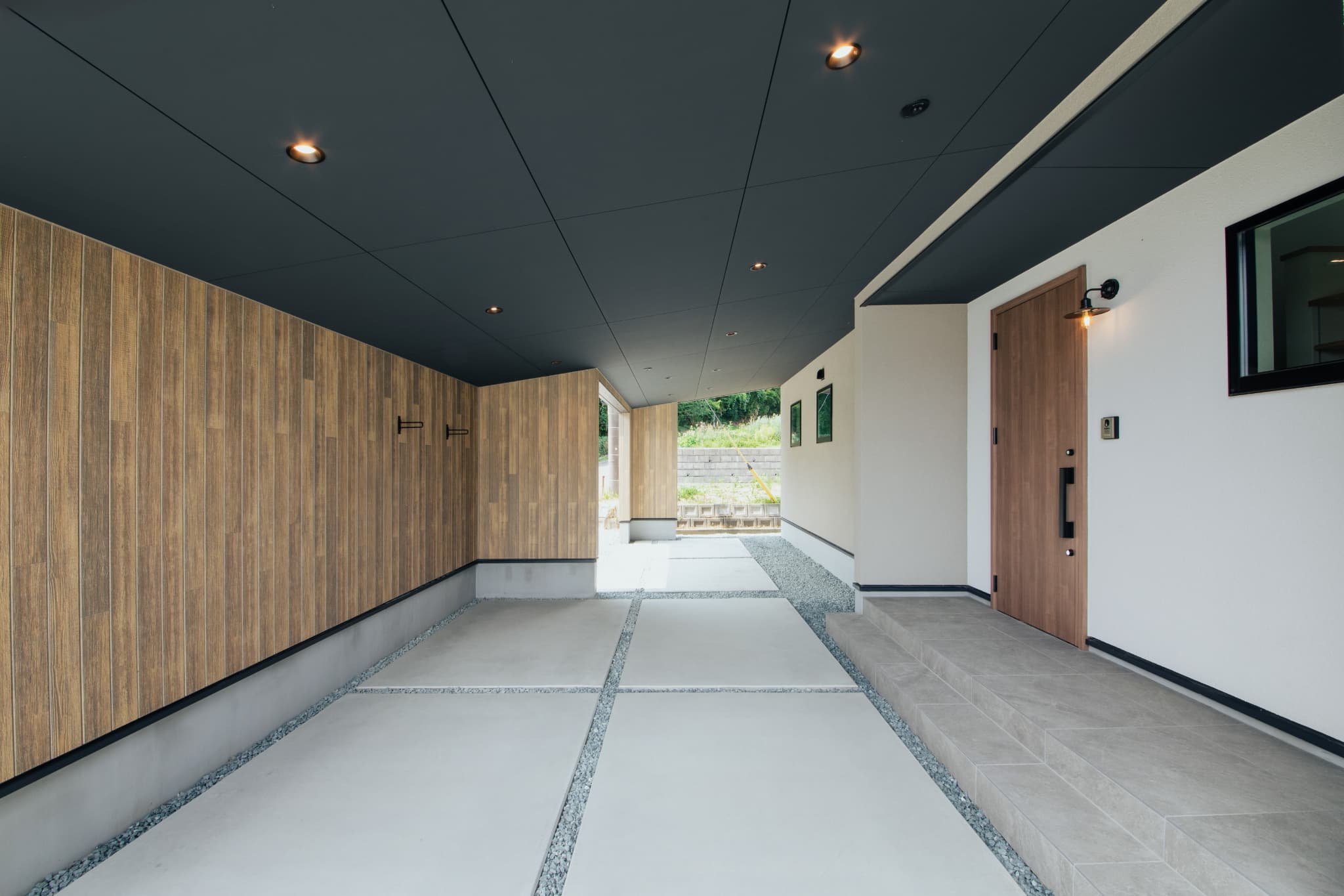 家と一体型のオープンガレージ 車から玄関まで雨に濡れずに移動できます。 |
