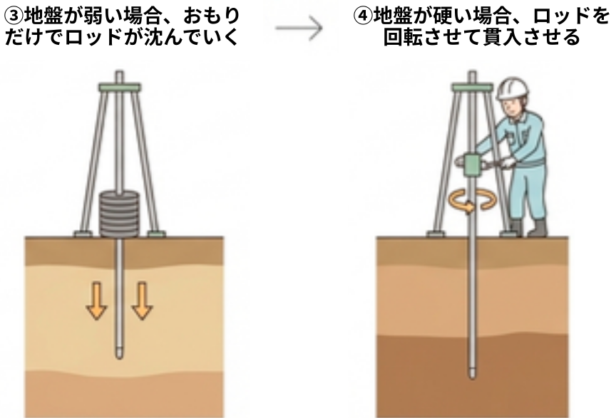 3.地盤調査「SWS試験」とは? 〈鉄の棒(ロッド)におもりを載せ、地面への沈み方や回転させての入り方で硬軟を判断します〉