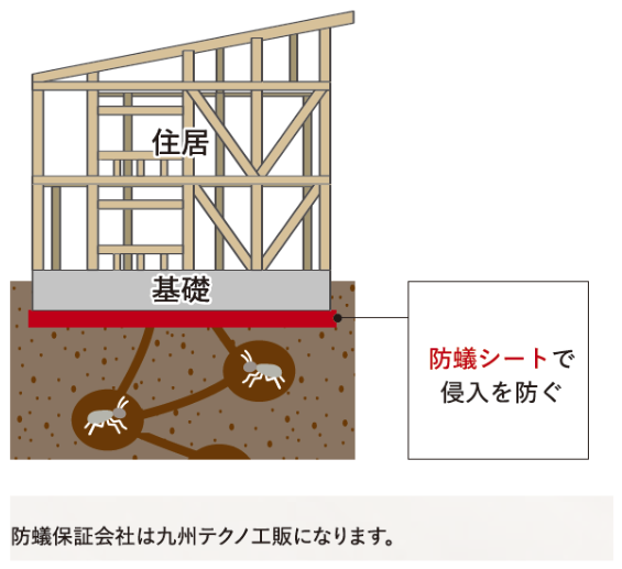 シロアリの侵入を物理的に防ぐ「ターミダンシート」を標準採用。薬剤に頼らない、人にも環境にも優しい対策です。